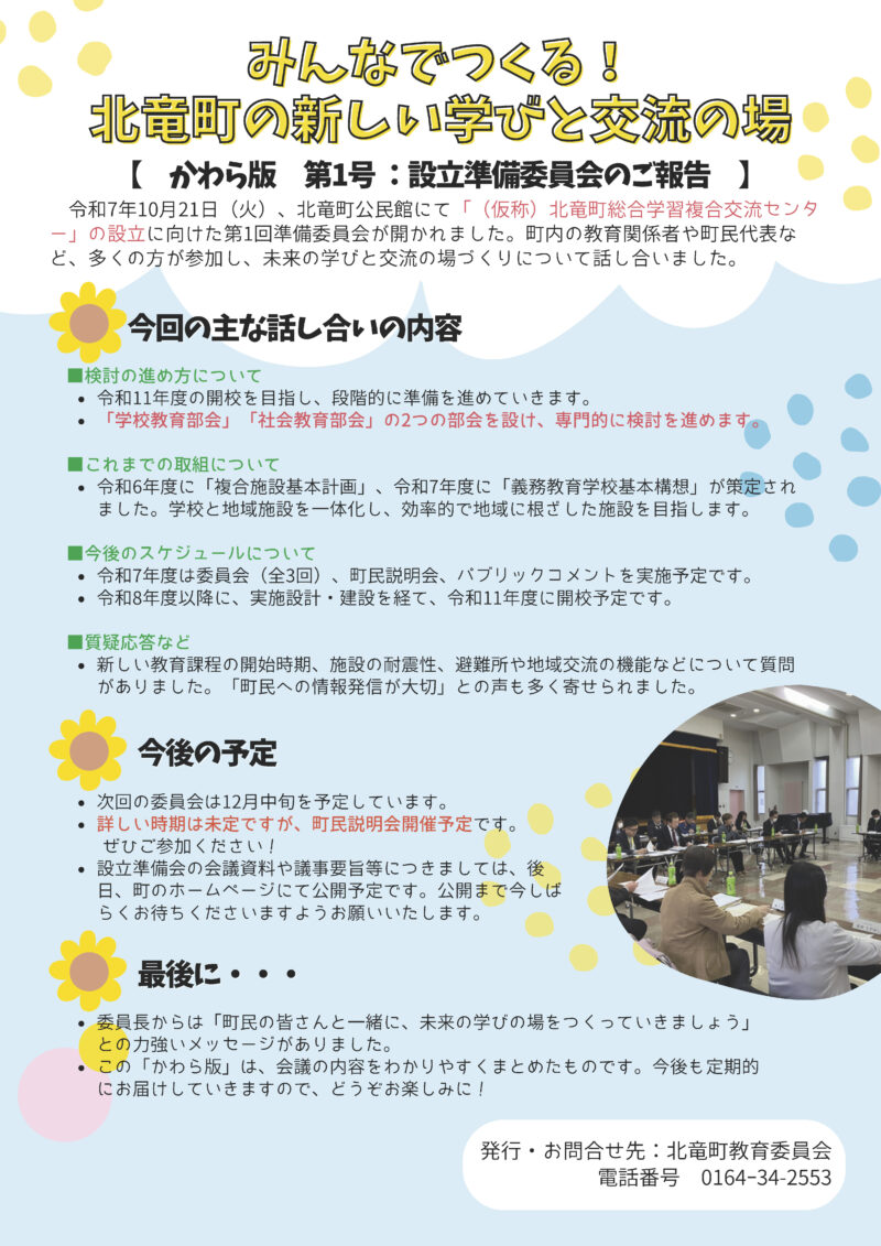 北竜町のこれからの学校づくり「かわら版」令和7年度 第1号 お知らせ&町の話題 2025.11.05 北竜町のこれからの学校づくり「かわら版」令和7年度 第1号 令和7年10月21日(火)、北竜町公民館にて「(仮称)北竜町総合学習複合交流センター」の設立に向けた第1回準備委員会を開催し、町内の教育関係者や町民代表など、多くの方が参加し、未来の学びと交流の場づくりについて話し合いました。詳細については、データをご覧ください。 また、これまでの経過等でご質問やご意見等がございましたら、お気軽にお問い合わせ下さい。 【問い合わせ先】北竜町教育委員会 TEL:0164-34-2553 PDFダウンロード