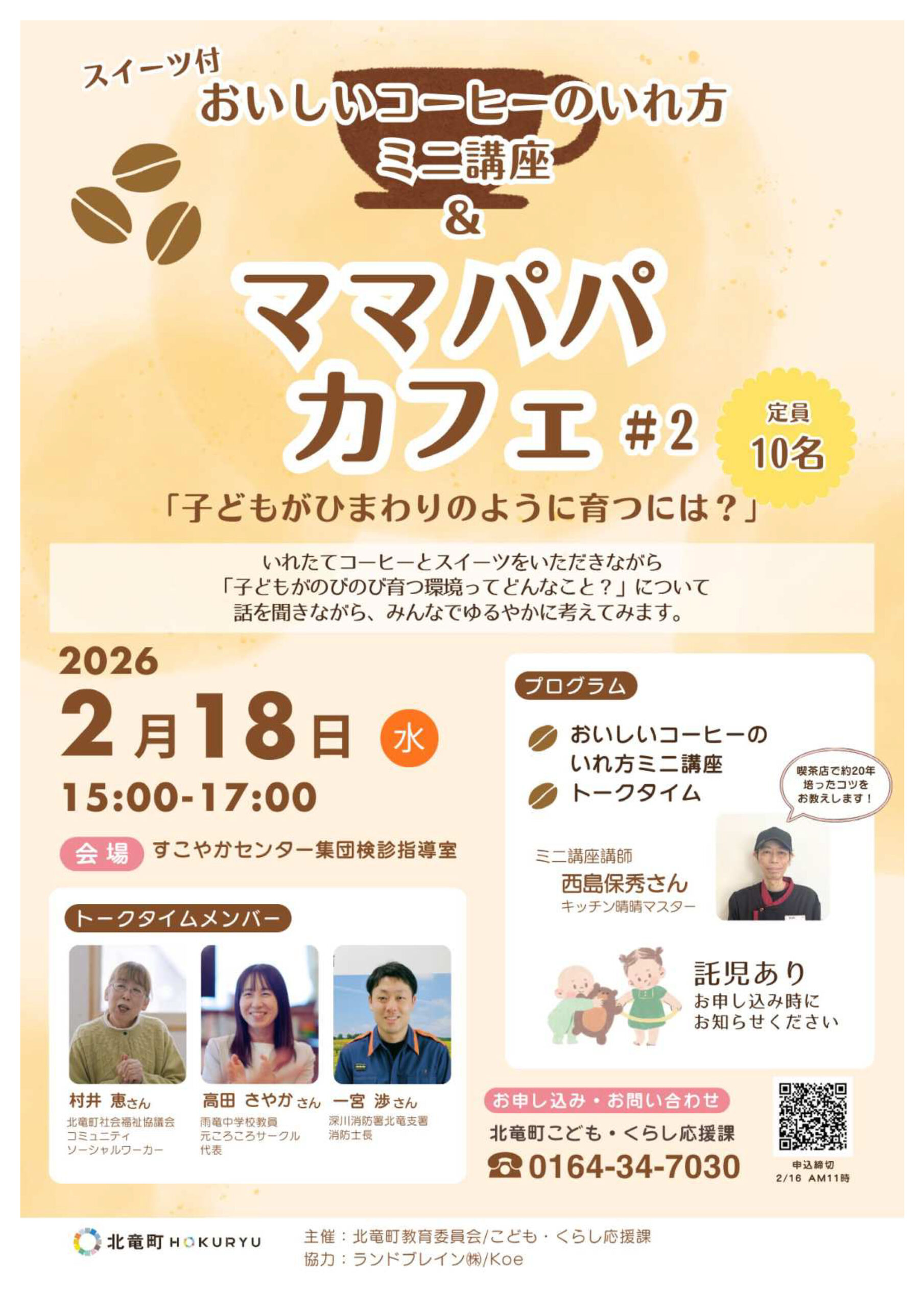 「ママ・パパカフェ#2」を開催します お知らせ&町の話題 2026.02.09 「ママ・パパカフェ#2」を開催します いれたてコーヒーとスイーツをいただきながら、「子どもがのびのび育つ環境ってどんなこと?」について、話を聞きながら、みんなでゆるやかに考えてみます。 詳しくは、チラシをご確認下さい。 PDFダウンロード