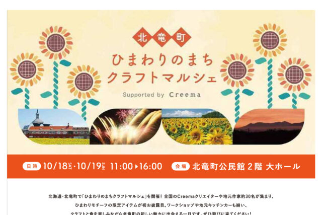 お知らせ&町の話題 北竜町ひまわりのまちクラフトマルシェの開催について 北竜町ひまわりのまちクラフトマルシェの開催について 日本最大のハンドメイドマーケットプレイス「Creema(クリーマ)」が10月18日(土)、19日(日)に「ひまわりのまちクラフトマルシェ」を北竜町において初開催致します。 今回、全国各地か... 2025.10.16 お知らせ&町の話題