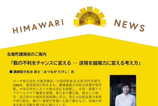 お知らせ&町の話題 北竜町地方創生講演会の開催について 北竜町地方創生講演会の開催について 「数の不利をチャンスに変える-逆境を越境力に変える考え方」と題して、福島県浪江町出身の松永武士を講師に迎え、被災地・浪江町での窯元再開と復興への挑戦を通じて、「困難をどう乗り越え、チャンスへ変えるか」を講... 2025.10.16 お知らせ&町の話題
