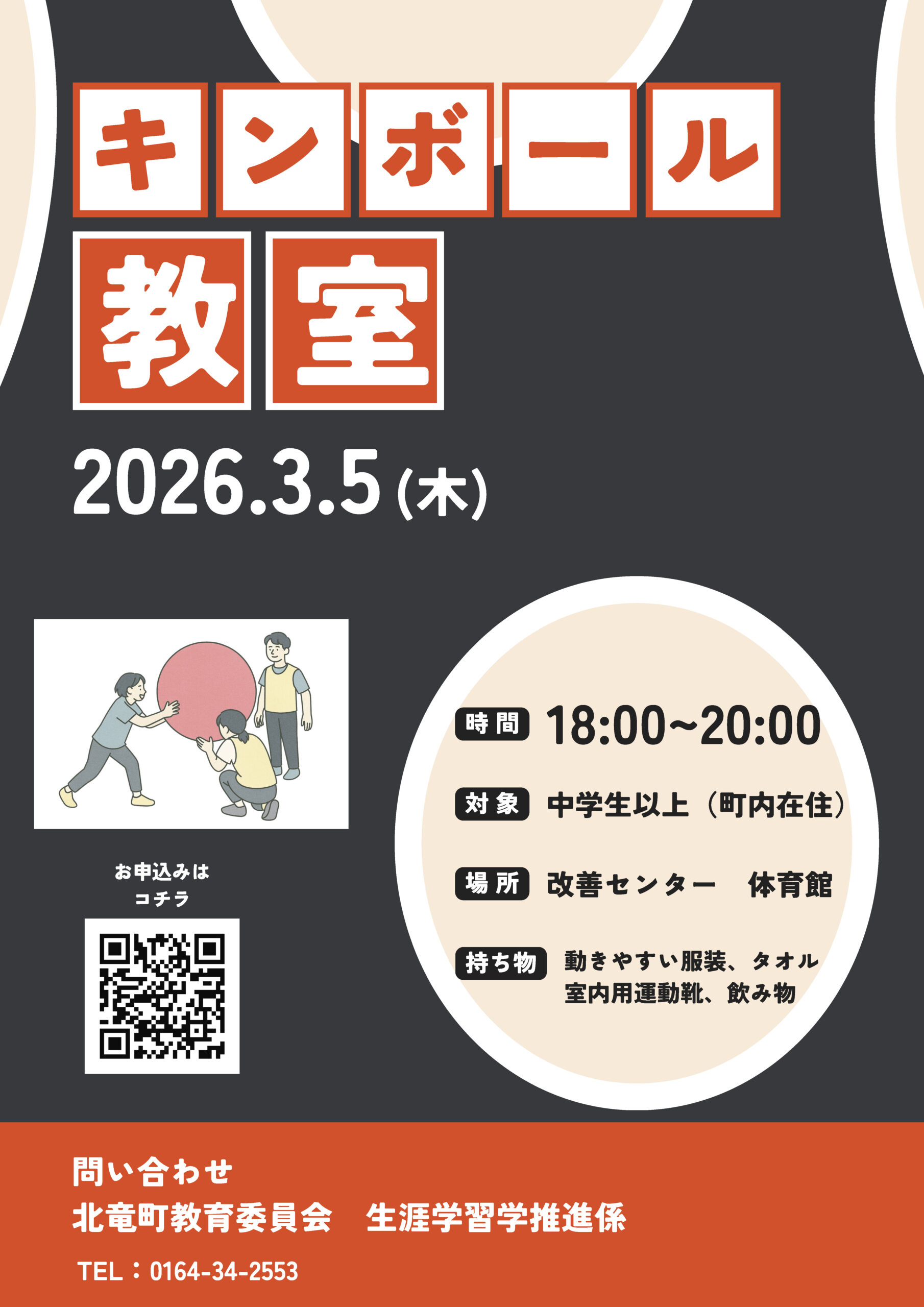 3月5日(木)18時より改善センター体育館にて「キンボール教室」を開催いたします。 参加を希望される方は2月26日(木)までに別添チラシのQRコードからお申し込みいただくか、教育委員会までお申し込み下さい。